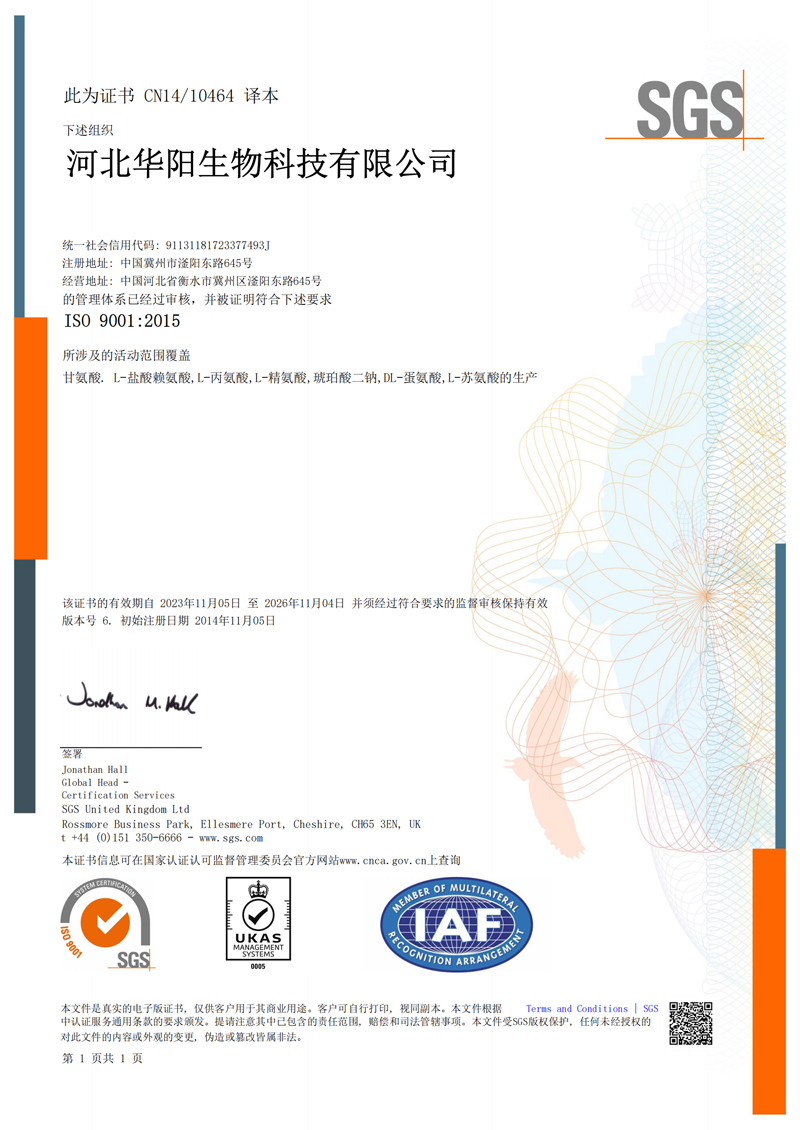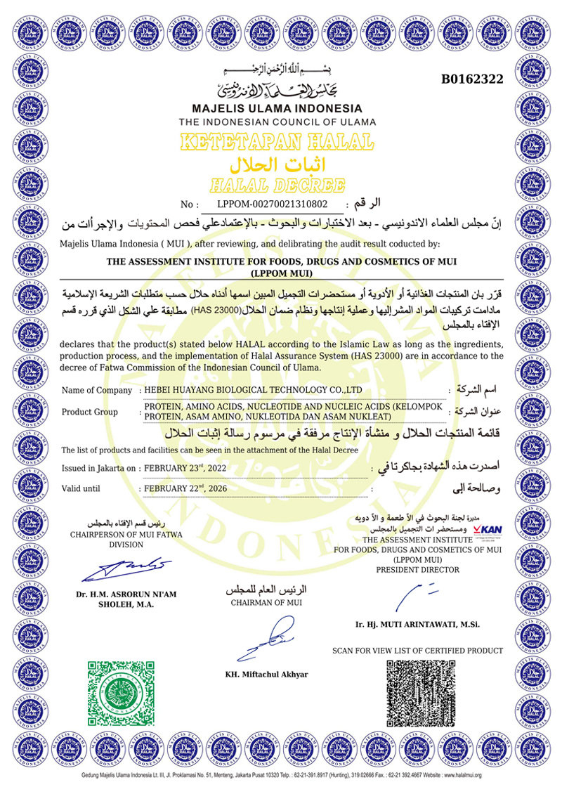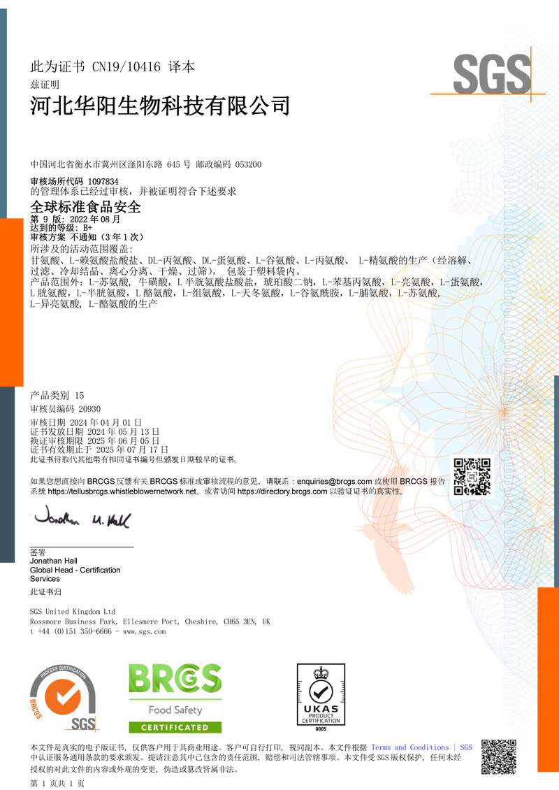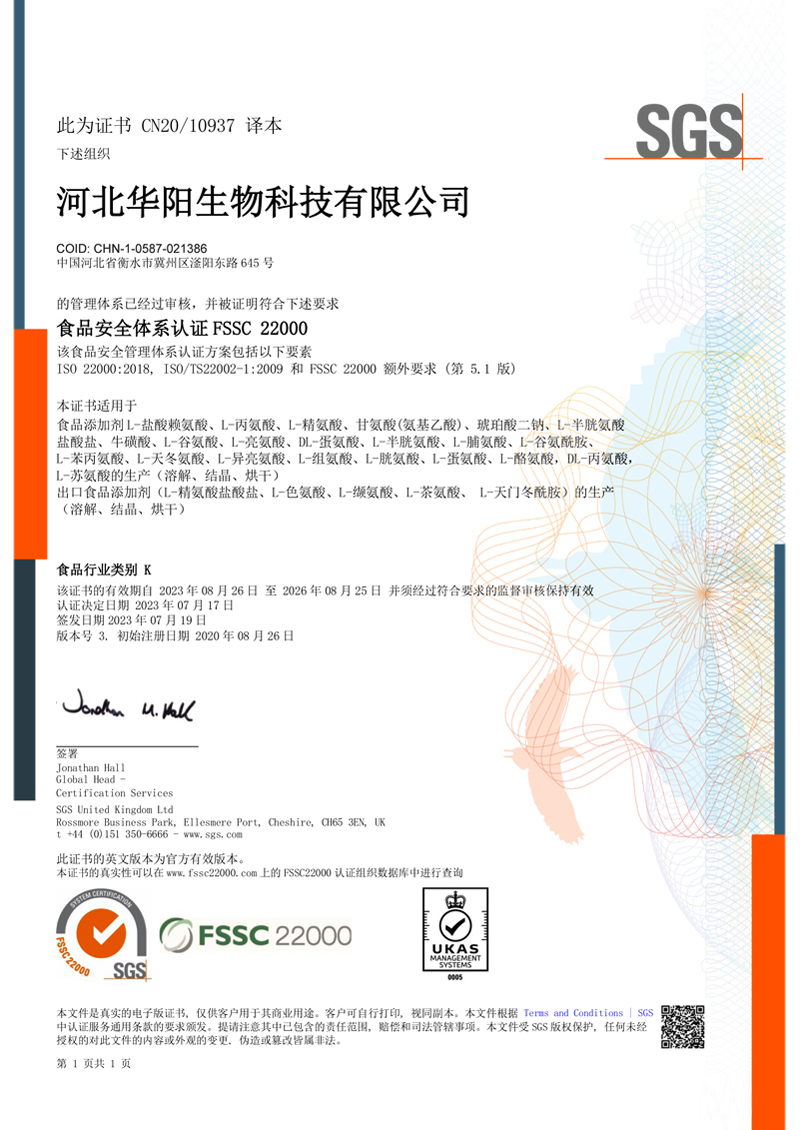 河北華陽集團(tuán)坐落于河北省衡水市冀州區(qū)省級工業(yè)園區(qū)(始建于1987年,前身為冀州市華陽化工有限責(zé)任公司)。集團(tuán)下屬四個(gè)公司:河北華陽生物科技有限公司、河北華悅氨基酸科技有限公司、滄州華晨生物科技有限公司、衡水市陽力商貿(mào)有限公司。主要生產(chǎn)甘氨酸、L-丙氨酸、L-蘇氨酸、DL-蛋氨酸、L-賴氨酸鹽酸鹽、L-半胱氨酸鹽酸鹽、干貝素等氨基酸系列食品級產(chǎn)品,廣泛應(yīng)用于食品、飲料、飼料等行業(yè)。......